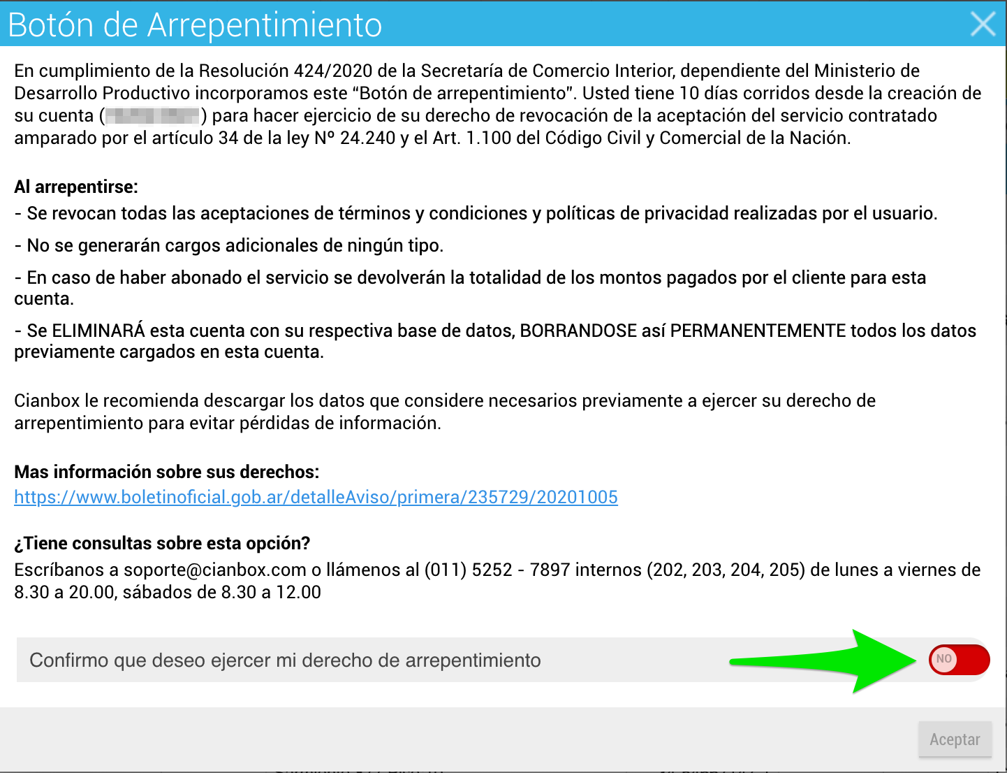En cumplimiento de la Resolución 424/2020 de la Secretaría de Comercio Interior, dependiente del Ministerio de Desarrollo Productivo incorporamos este “Botón de arrepentimiento”. Usted tiene 10 días corridos desde la creación de su cuenta para hacer ejercicio de su derecho de revocación de la aceptación del servicio contratado amparado por el artículo 34 de la ley Nº 24.240 y el Art. 1.100 del Código Civil y Comercial de la Nación.
